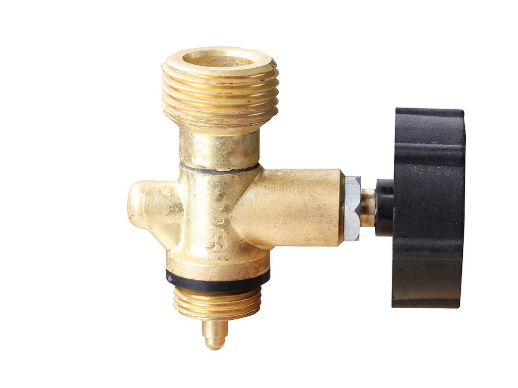 Jednocestný uzavírací ventil k 2kg propanbutanové lahvi s výstupním závitem W21,8L.